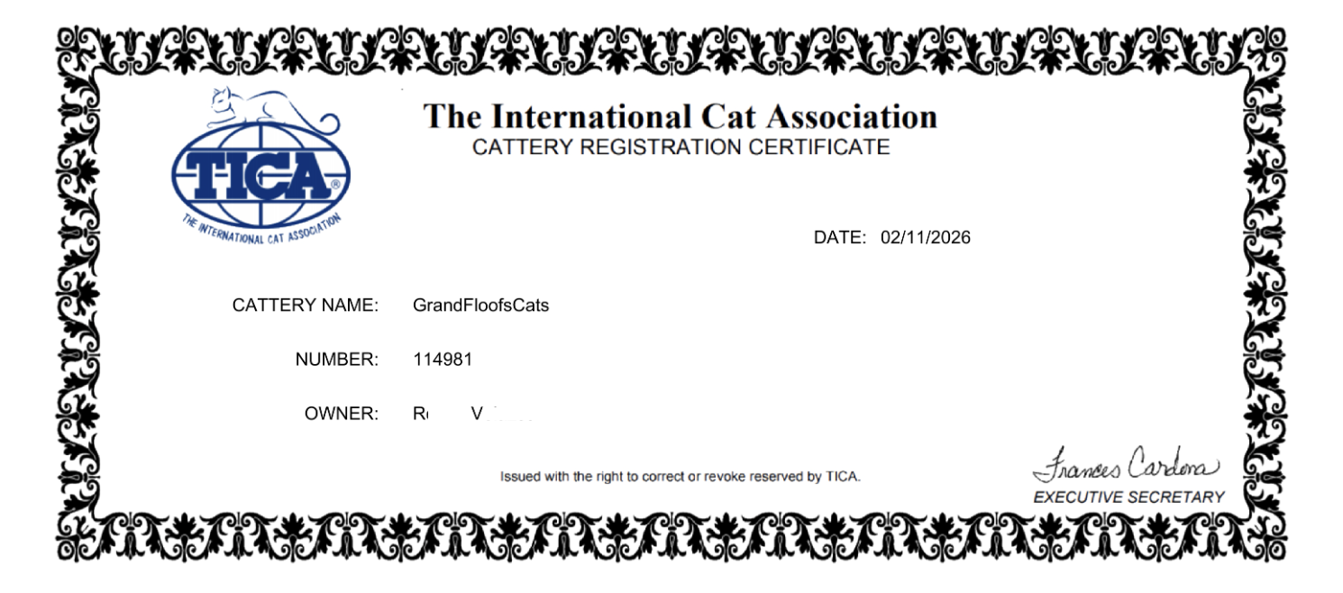 Our cattery name is registered with The International Cat Association (TICA). We operate as a companion-only program, and our kittens are placed as beloved family pets — not for breeding or show purposes.