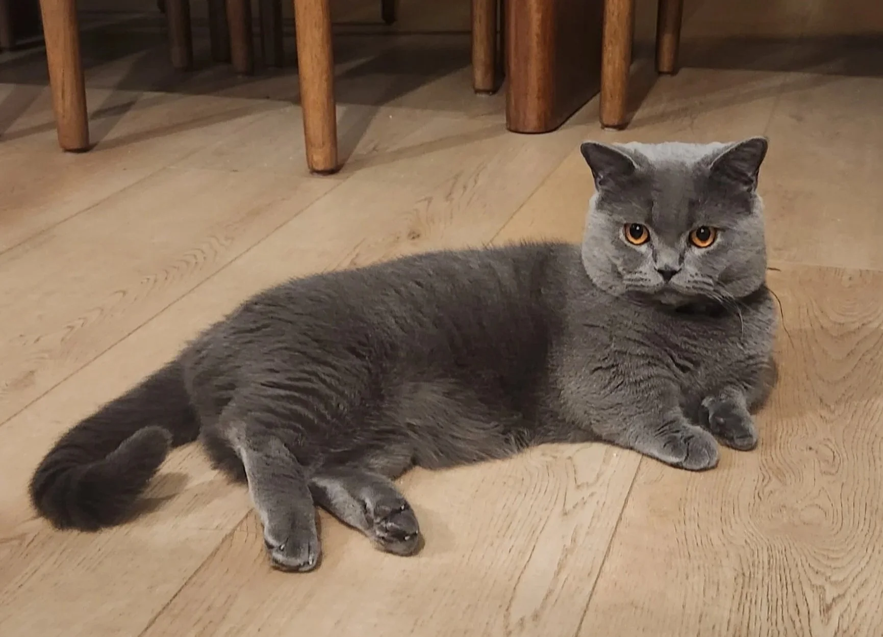 Kazi is our handsome British Shorthair king with a striking blue-gray coat and captivating golden eyes. Strong, calm, and incredibly affectionate, he represents the classic British Shorthair look and temperament we strive for in our breeding program.